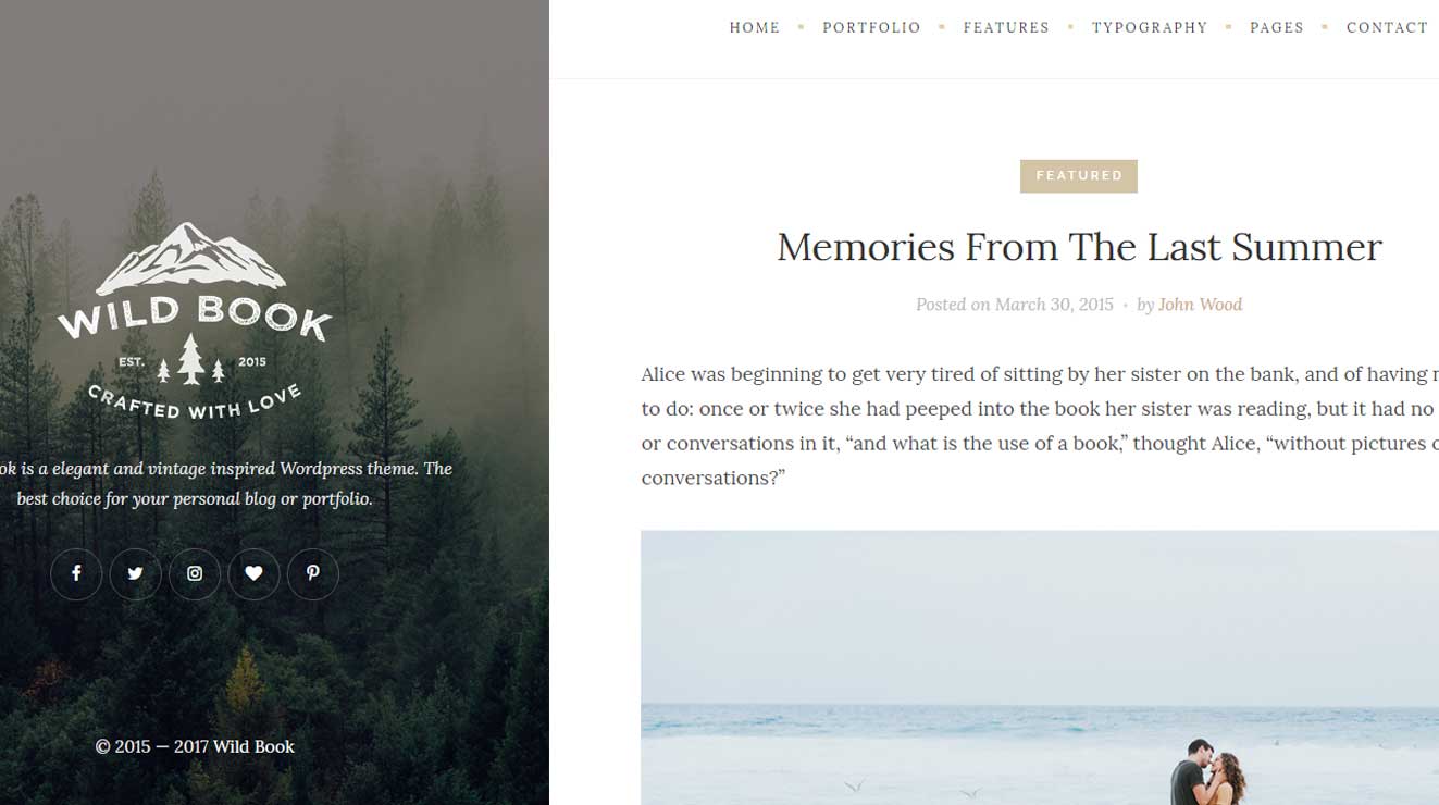 Wild Book es una buena opción para blog personal o sitio web de la viajes o turismo. Estructura basada en un diseño de página dividida, con menú vertical y el fondo adaptable.